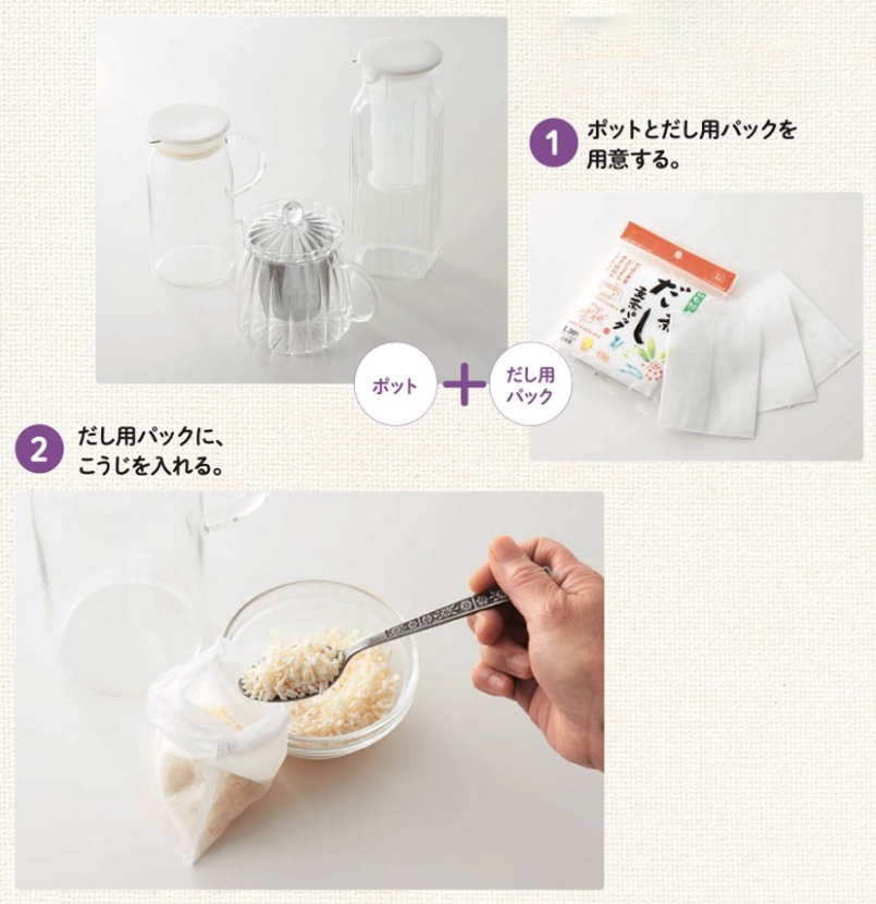 こうじ水を3回くり返して使ったあとは、だしパックに入れたまま浴槽へ。入浴剤として活用できます。