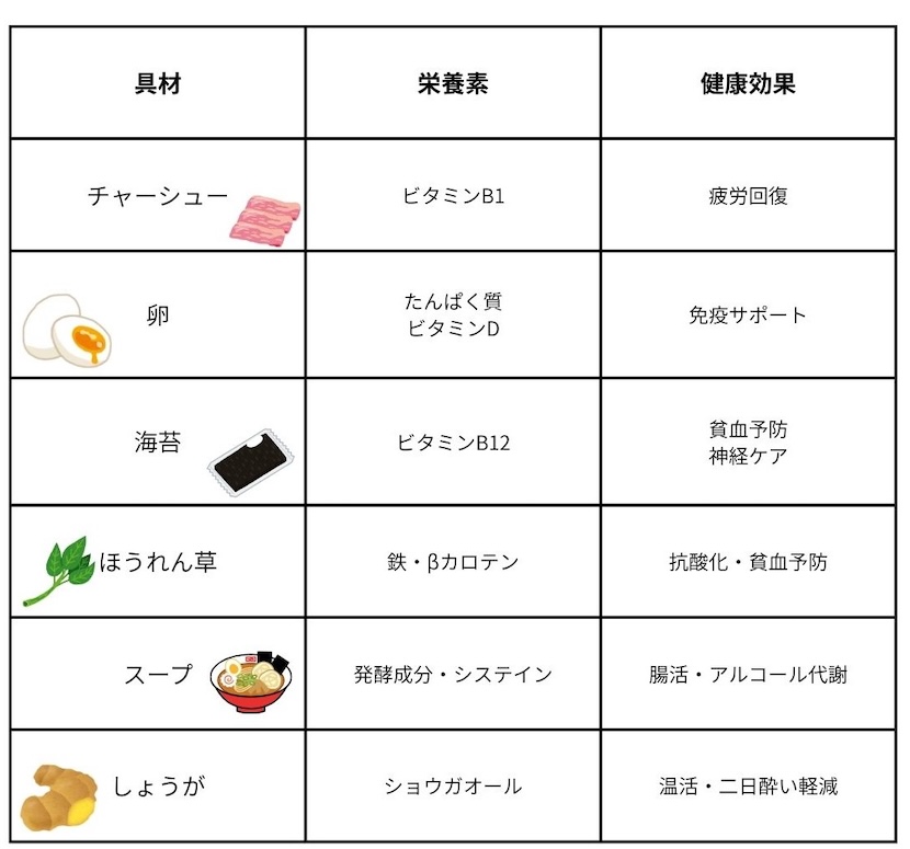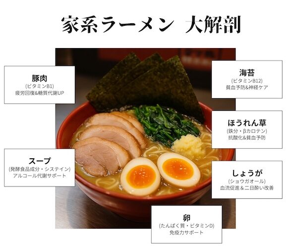 スープで水分・塩分を補給し、豚肉や卵に含まれるアミノ酸が肝臓をサポート。麺の炭水化物でエネルギーをチャージします。アルコールで消耗した体を回復させるには、実は最適な組み合わせなのです。