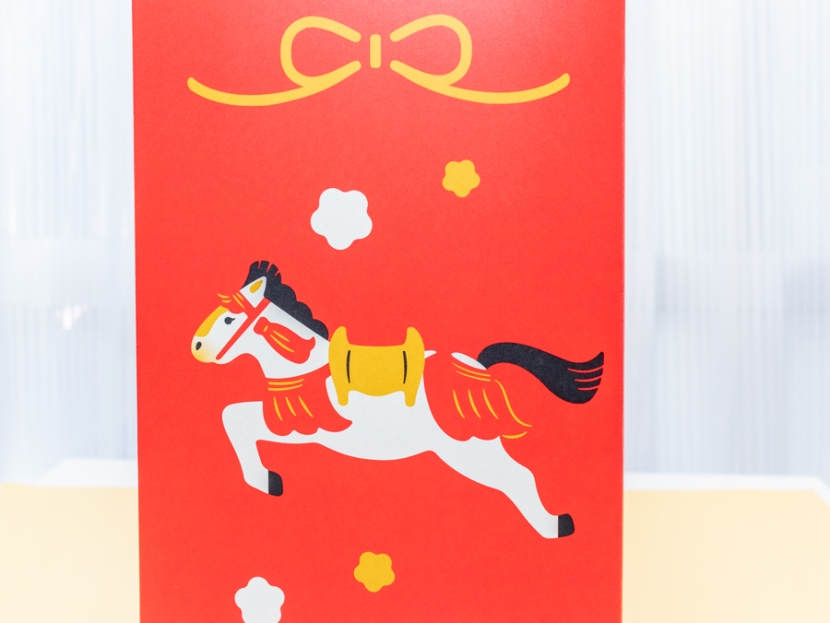 側面は躍動感のある馬(午)と、お年賀の熨斗(のし)の蝶結び(花結び)の水引が描かれています。