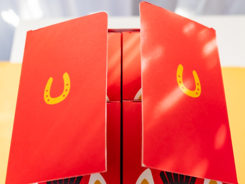 外箱を開封すると、蹄(ひずめ)のイラストが表れました。こうした遊び心、好きですね。これまでの「ゆかり」のイメージは、日本の伝統を大切にする、海老せんべい一筋の、いい意味で真面目一本でした。ただ、『〈ゆかり〉干支ノ箱BIG[午(うま)]』を知って、ユニークな一面があることを知りました。
