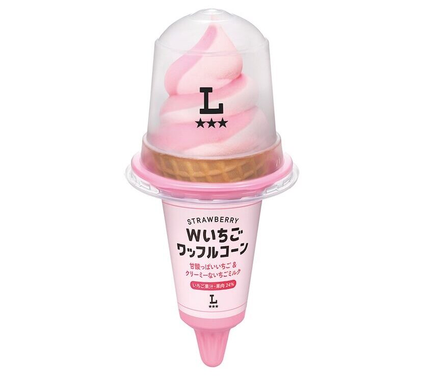 甘酸っぱいいちごアイスとクリーミーないちごミルクアイスの2つの味が楽しめるワッフルコーンアイス。