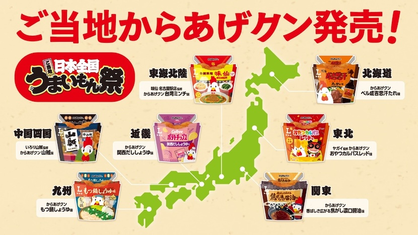北海道、東北、関東、東海・北陸、近畿、中国・四国、九州・沖縄の7つの地域ごとに、ご当地の食材やソウルフードとコラボした“ご当地からあげクン”が1月13日(火)より発売されます。
