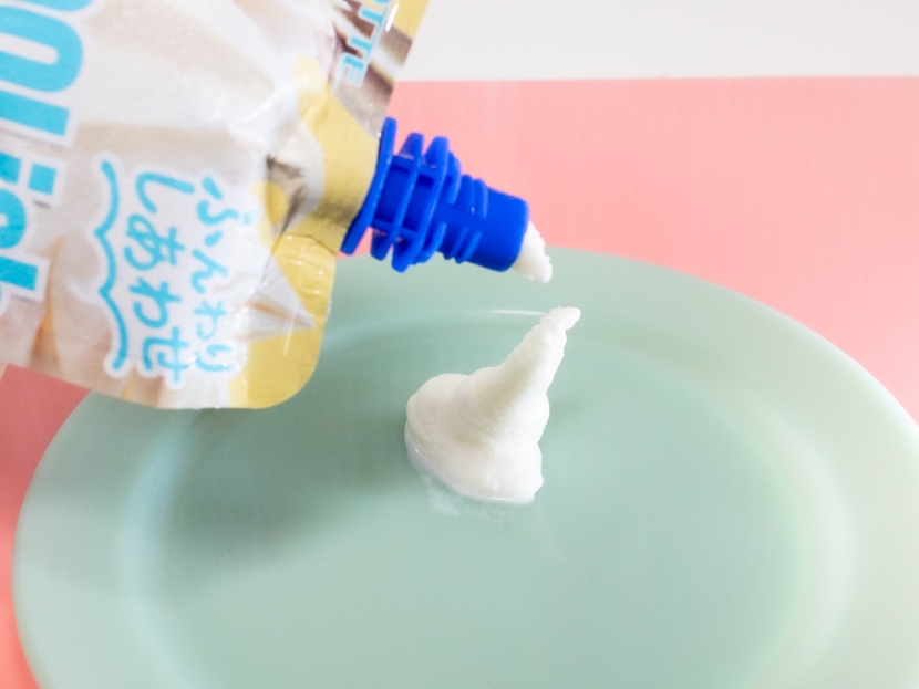 パウチの口を開けると、ふわっとした甘いミルクの香りが鼻に抜けて、ホイップクリームの甘い練乳寄りの香りが漂ってきました。口に入ってくる食感は、通常のバニラ味の「クーリッシュ」よりも、少しだけふんわり・なめらか寄りの印象。けっこう冷たいのに、ミルキーなパウダー感もあり、手作りホイップクリームのような味わいがおいしい!
