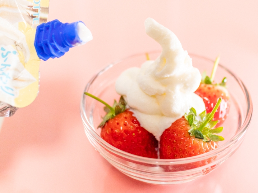 直飲みの余韻覚めやらぬまま、公式でも『クーリッシュ ホイップクリーム』のアレンジとして、フルーツにかけて楽しむアイデアが紹介されています。そこで定番の「いちご × ホイップ」コンビを、試してみました。