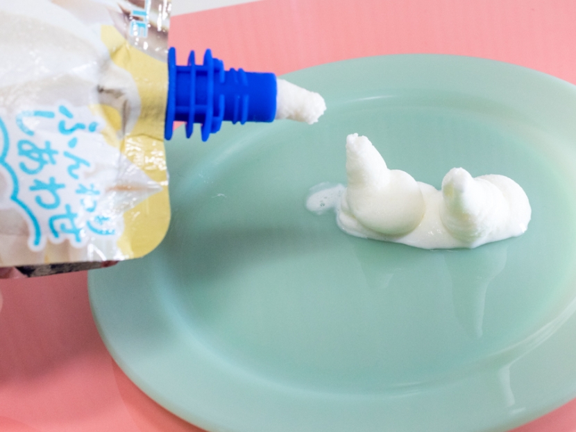 ただ、しぼり出したら生クリームのようにデコレーションできるかと思ったら、意外と難しい。うまくホイップのツノが作れません。そのまま食べるとホイップクリームだというのに、絞って外に出ると意外に固め。しかし時間が経つと溶けて水っぽくなってしまう。