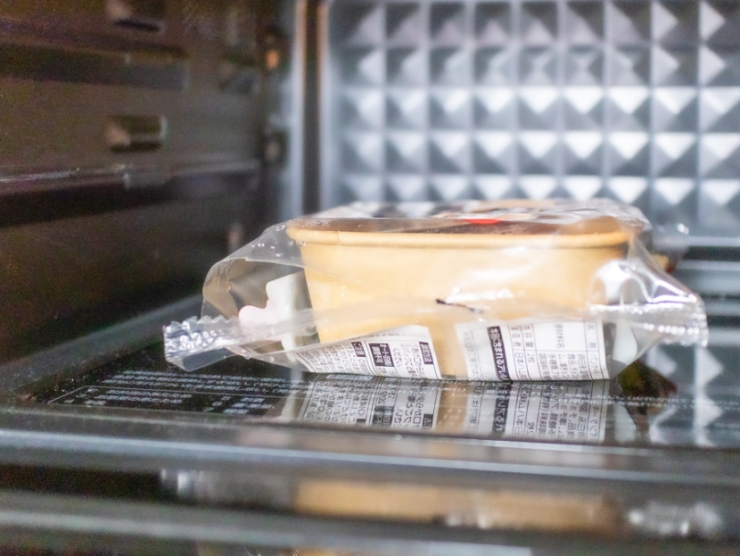 実際に食べる際は、パッケージに少し切れ目を入れてから電子レンジで温めて食べます。「1500Wなら20秒、500Wなら50秒」と書かれており、筆者は500Wで50秒温めました。
