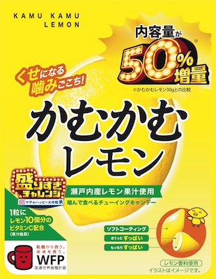 従来品の「かむかむレモン 30g」と比較して、内容量を約50%増量。瀬戸内産レモン果汁を使用したチューイングキャンディーで、「クセになる噛みごこち!」とパッケージに書かれています。なんと、2002年発売のロングセラー商品。