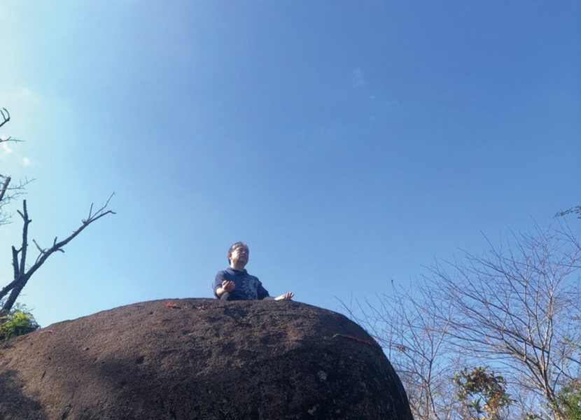 鹿児島・川平の巨石で深く瞑想するケイ先生。
