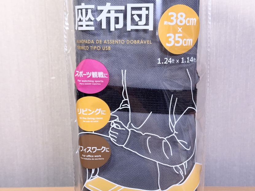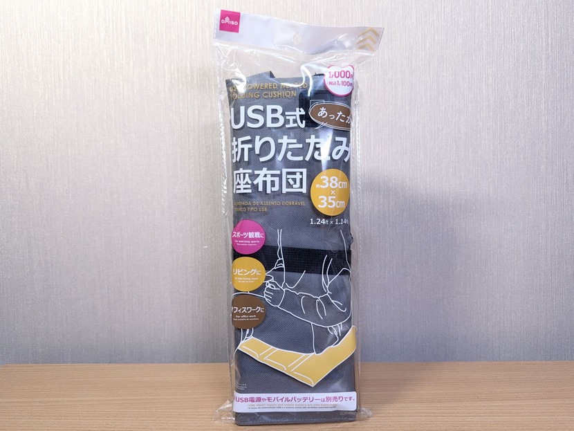 屋外でも使える座布団型のホッカイロでもあればいいのに……と思っていたら、その願いが通じたのか、我らがダイソーから求めていたものが発売されていた。それが『USB式あったか折りたたみ座布団(38cm×35cm×2cm・希望小売価格 税込1,100円・発売中)である。