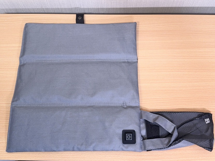 『USB式あったか折りたたみ座布団』は3つ折りに折りたためるのも大きな特徴で、使わない時はコンパクトに収納できる。リュックに入れられるサイズ感だし、重さも約167gとかなり軽い。バンドも付いているからまとめるのもらくちん。