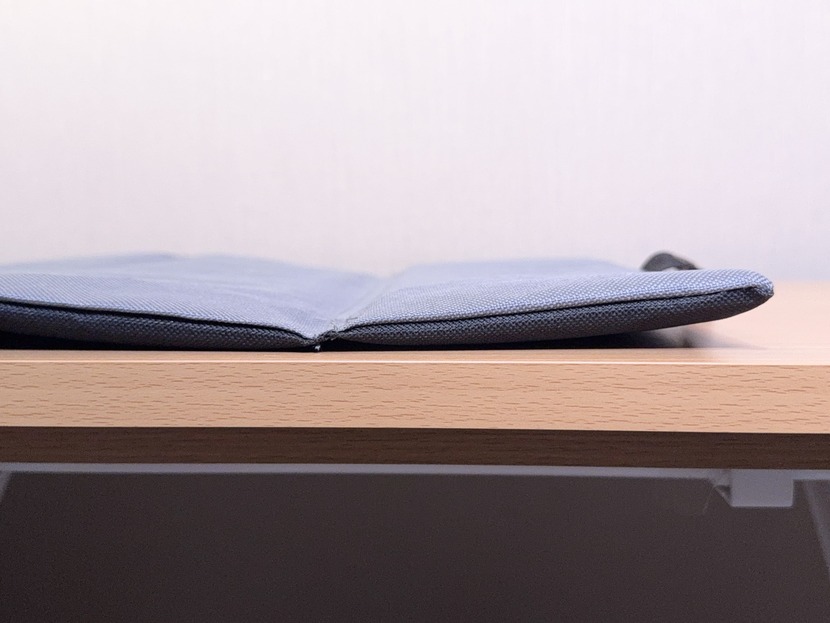 厚みは実測で約1cm。粗忽期間はあるが、固めのクッションが入っているので地面のゴツゴツ感は感じにくい。屋外で使ってもすぐにお尻が痛くなることはなさそうだ。