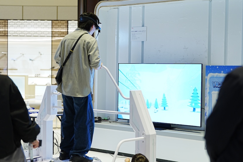 イベントの中核を担うのが「TCL スキーシミュレーター体験エリア」。最先端のVR技術を活用し、実際の競技コースを再現したステージをTCLの大画面ディスプレイで没入体験できます。来場者は体を左右に傾けながらスキー競技に挑戦し、まるで本物のゲレンデに立っているかのような興奮を味わっていました。