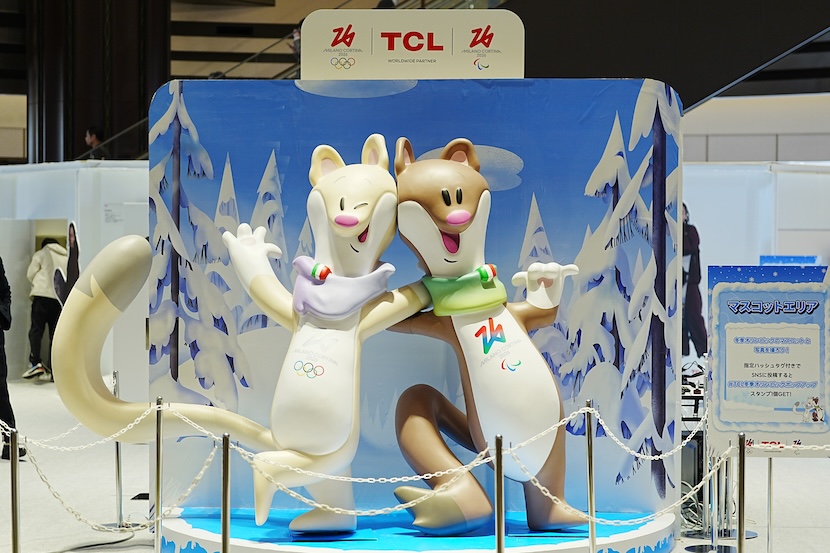 会場には、VR(ヴァーチャルリアリティ)スキー体験エリア、公式マスコット「ミロ」「ティナ」の巨大フィギュア展示、TCLの最新家電展示、そして高さ約2.5mの巨大ガチャガチャマシンという、オリンピックの世界観を体感できる体験型コンテンツが集結。入場無料ながら、多くの来場者で賑わいを見せていました。