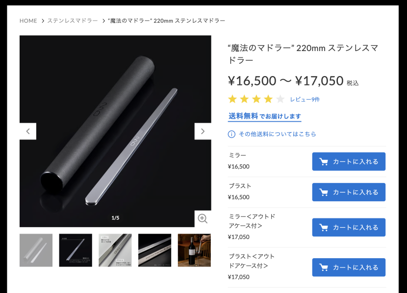 サイズは220mm。タイプは表面がツルツルした「ミラー」と、マットな質感の「ブラスト」の2種類で、価格はいずれも16,500円(税込)。アウトドアケース付きモデルは17,050円(税込)です。220mmのマドラーの他にも170mmタイプもあります。