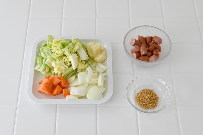 レシピ通りに材料をカットします。今回も調味料はコンソメ程度で、とてもシンプル。それでも味がしっかりしている理由は、調理工程にありました。撹拌しながら加熱することで、具材に細かな裂け目が入り、素材の旨みがスープにしっかり溶け出す仕組み。野菜から出る水分と旨みで、深みのある味わいになります。