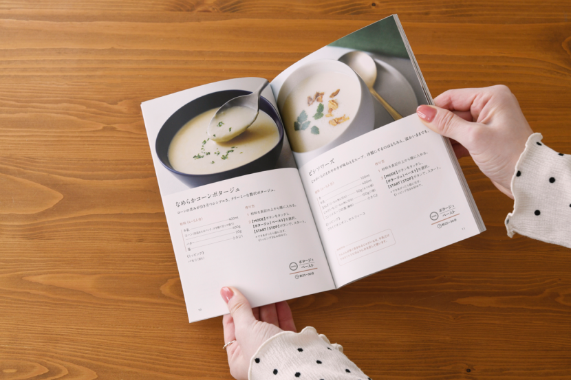 まずは王道のポタージュから。本体にレシピブックが付いてくるからいろいろ作れる付属のレシピブックは全36レシピ掲載。初めてでも迷いません。