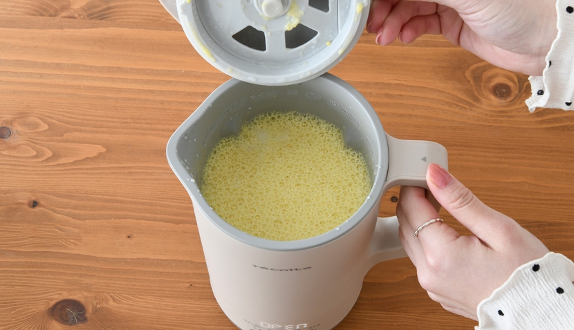 蓋を開けると、ふわっと広がるコーンとバターの香り。そして気づいたのが、注ぎやすさへの配慮。ポット本体はやや重量感がありますが、底面が丸みを帯びたシリコン仕様になっていて、テーブルに底をつけながら安定させて斜めに傾けると、スムーズに注ぐことができます。細かいですが、こういう設計って実際に使うとありがたい。
