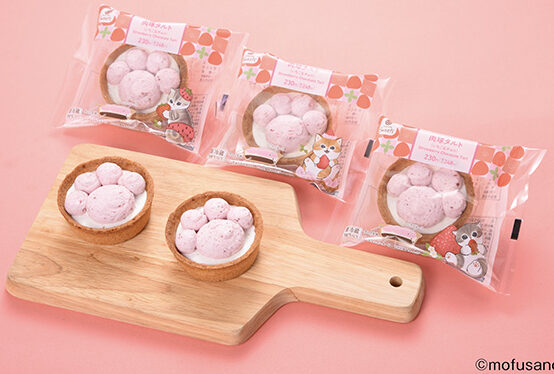 「ファミリ~にゃ~ト大作戦!」の顔ともいえる看板商品。にゃんこの肉球をイメージしたいちごムースをトッピングしたタルトで、台の中にはなめらかなチョコカスタードが詰まっています。mofusandとコラボしたパッケージは全3種類。