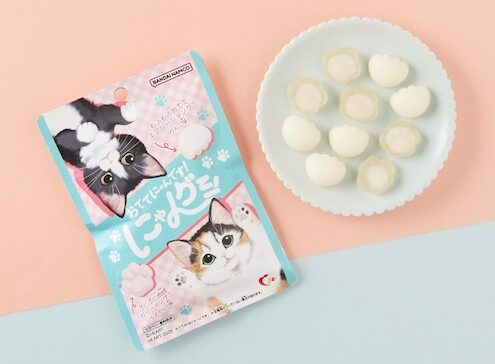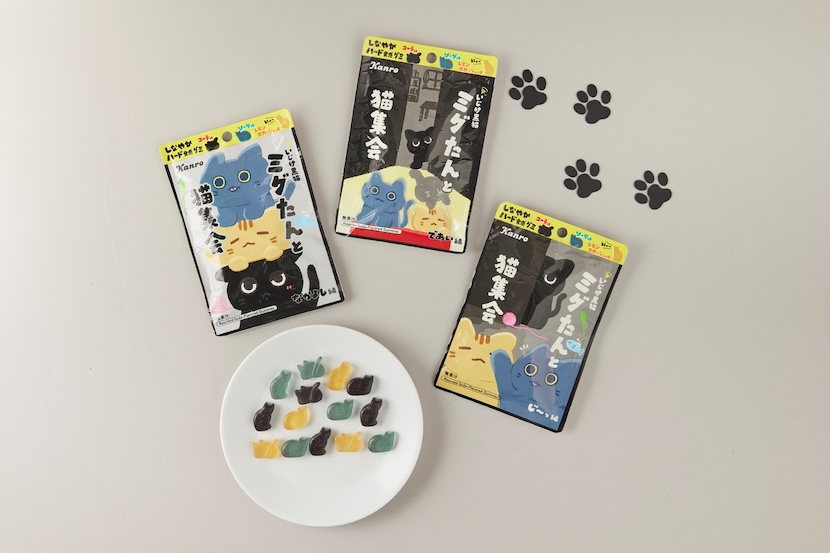猫のしなやかな動きに着想を得た、ハード食感のグミ。黒猫ミグたん(コーラ味)、茶猫ミーたん(レモンスカッシュ味)、ブルーグレー猫グーたん(ソーダ味)の3種が1袋に入っています。”猫集会”をテーマにしたユニークなキャラクター設定で、グミのフォルムと色味もがなんともキュート!