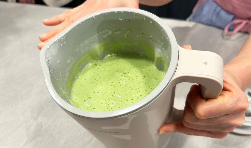 新モーターの影響で定番のポタージュスープも進化しました。高速回転で空気を巻き込みながら仕上げることで、ミルクフォームのようなクリーミーなポタージュに仕上がります。発表会では、レシピ監修を担当した料理研究家・管理栄養士の前田量子先生が、冷凍ブロッコリーを使ったポタージュ作りを実演してくれました。材料はブロッコリー、牛乳、コンソメのみというシンプルさで、分量も牛乳と食材が1:1と覚えやすいレシピ。先生の「毎日のことだから、これくらい手軽でいいんです」という言葉が胸に沁みます。