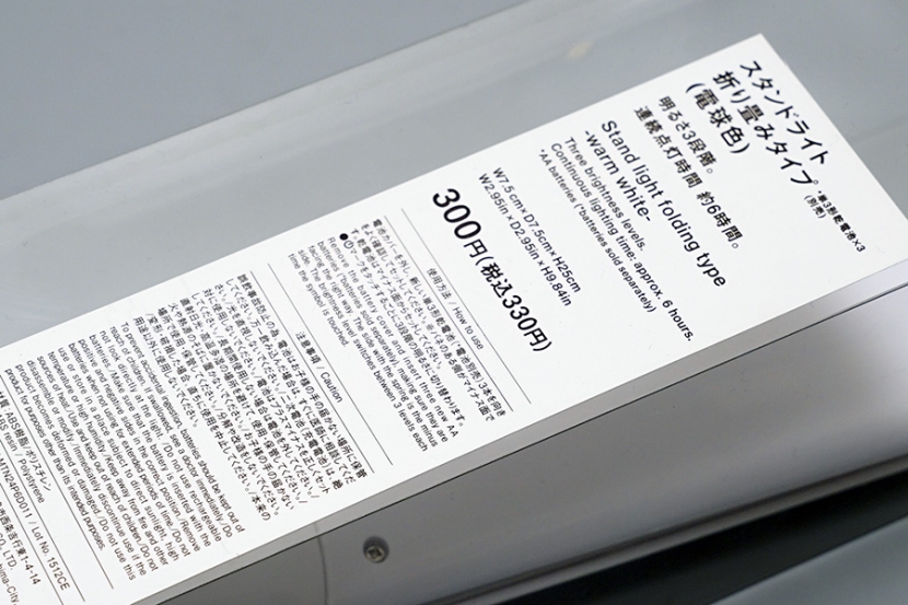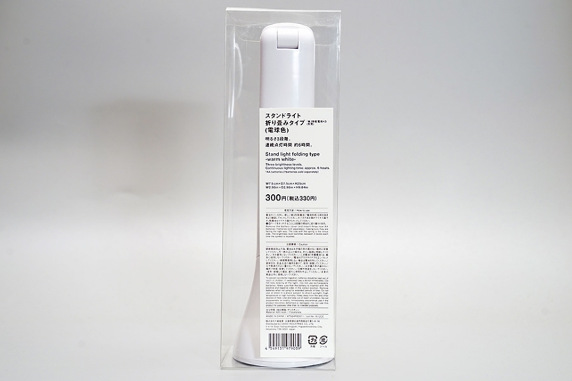 白色のプラスチックの本体は、折りたたみ式でパッケージされた状態ではよくみえませんがLEDライトが配置されているよう。明るさは3段階に調整でき、単3形乾電池3本で6時間点灯するといいます。価格は税込330円! あまりの安さに2度見しましたが本当に330円でした。