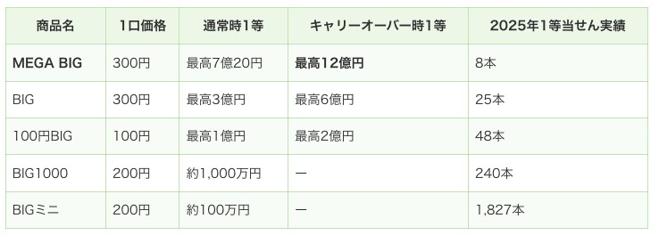 「とにかく1度当せんを体験してみたい」という方には、当せん確率が比較的高いBIGミニや、100円から買えて気軽な100円BIGから始めてみるのもひとつの楽しみ方です。