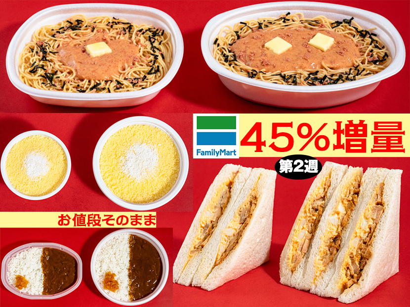 3月24日からスタートしたファミリーマートの創立45周年記念キャンペーン「なぜか45%増量作戦」。第1週のクレープ・生コッペパン・ラーメンなどが反響を呼ぶなか、第2週はまた違ったジャンルの人気商品が勢ぞろいします。がっつり食べたい日のランチにも、ちょっと甘いものが食べたいときにも対応できる、バランスのいいラインナップとなっています。