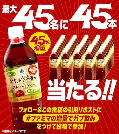 ファミリーマート公式X(@famima_now)では、対象の投稿に「#ファミマの増量でガブ飲み」をつけて引用ポストすると「Afternoon Tea監修 シャルドネ香るストレートティー 950ml」が最大45名に45本プレゼントされるキャンペーンを引き続き実施中(応募締切:4月6日(月)23:59)。増量商品をゲットしつつ、SNSキャンペーンにも参加してみては?