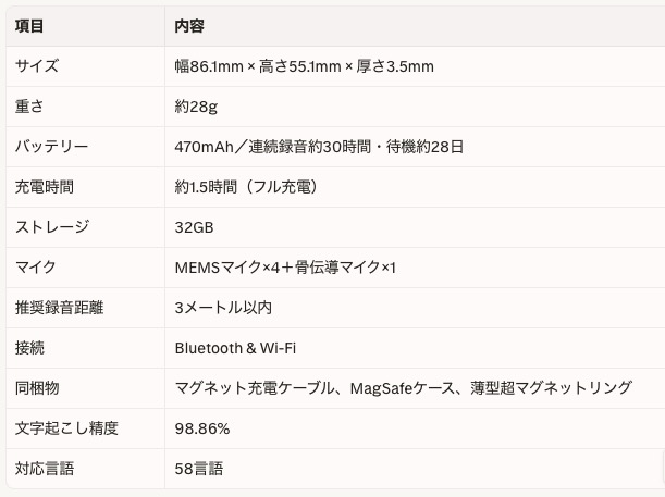 さらに付属のMagSafeケースを装着することで、対応スマホに磁力で固定。通話内容を録音して文字起こし・要約ができるのは、ややこしい上司の指示がある場合などかなり安心度が高い!