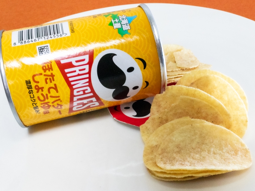 北海道の土産店中心に入手できる『プリングルズ ほたてバターしょうゆ味』(53gショート缶)は、旨みたっぷりのほたてをコクのあるバターと香り豊かなしょうゆがジュージュー彩るほたてバター味。