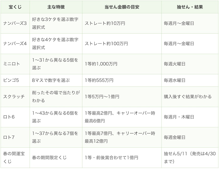 そこで今回は、宝くじ公式サイトとみずほ銀行の公開情報をもとに、当せん金額、抽せん頻度、買いやすさ、結果がわかるまでの早さに注目して、春におすすめの宝くじを8つ紹介します。