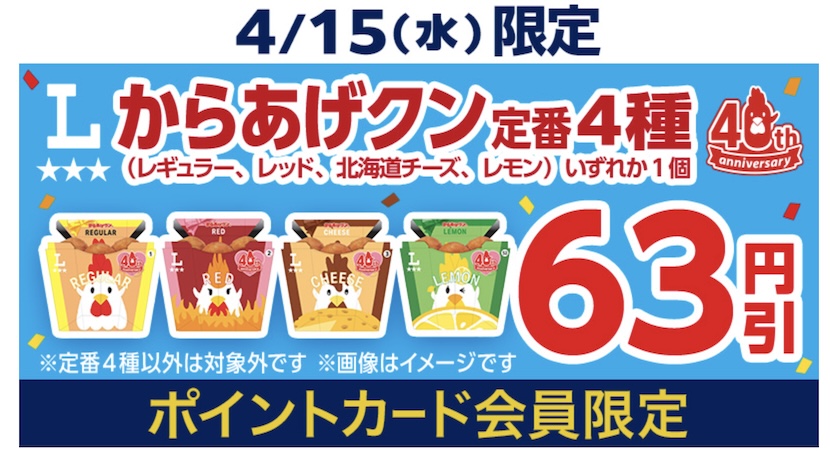 4月15日(水)限定で、からあげクン定番4種(レギュラー・レッド・北海道チーズ・レモン)が、ローソン公式アプリにポイントカード(Pontaカードやdポイントカードなど)を登録している会員を対象に、いずれか1個63円引きになるキャンペーンも実施されます。定番4種以外は対象外です。