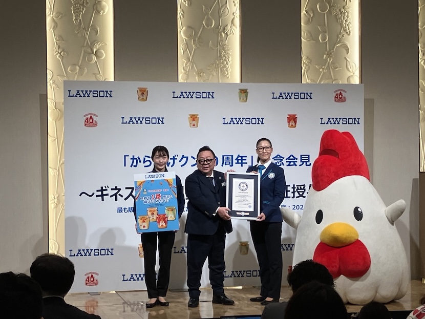 4月6日、「からあげクン40周年記念会見」にて。ギネス世界記録公式認定証を授与。