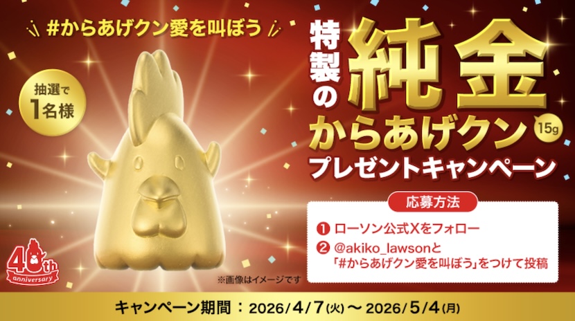 ローソン公式Xアカウントをフォローし、指定ハッシュタグを付けて投稿すると、抽選で1名に特製の純金からあげクンが当たる企画で、40周年ならではのプレミア感があります。