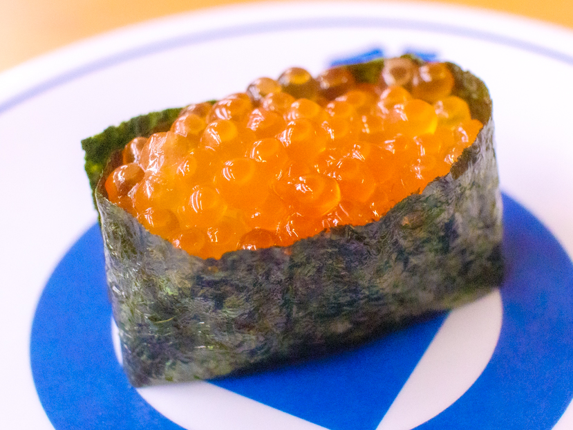 いくら好きにぜひ試してほしいのが、「海水仕込み 純いくら(一貫)」(税込330円)。水揚げ場近くの加工場で素早く加工した鮮度抜群のいくらを使い、あえて醤油や塩に漬け込まず、“海水仕込み”のまま提供するのが特徴です。