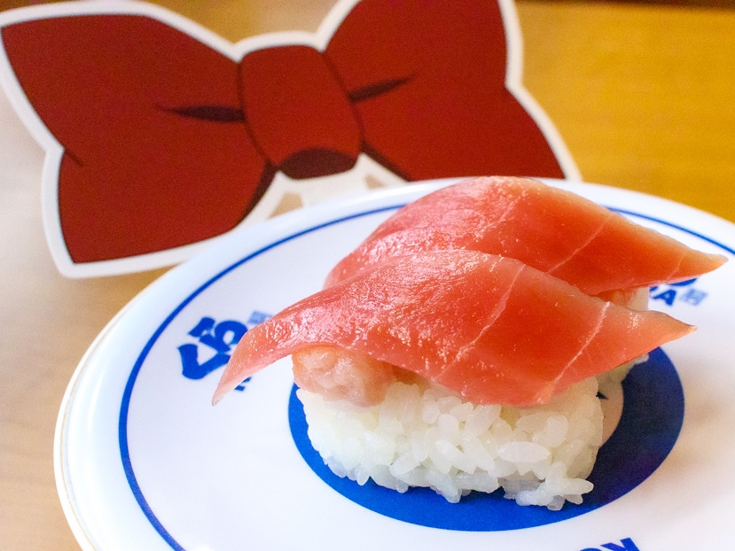 「江戸川コナンのトリックまぐろ」(税込300円)は、一見ふつうのまぐろ2貫に見えるのですが、熟成まぐろの下にねぎまぐろが隠れている“二重構造”寿司です。コナンの赤い蝶ネクタイをイメージした変声機ピック付きで、見た目のテンションも上がります。